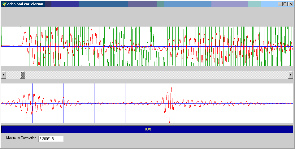 The lower trace in the image above shows the signal after its been processed by the correlation routine. The direct wave is a bit funny because the mic is beside the speaker and not in front of it. The echo shows a nice spike plus some secondary peaks. We expect some secondary peaks because the auto-correlation has them. This suggests that they are not real or at least are larger than they should be.