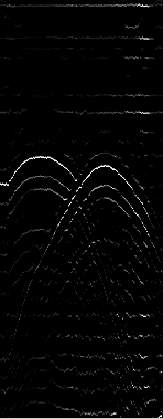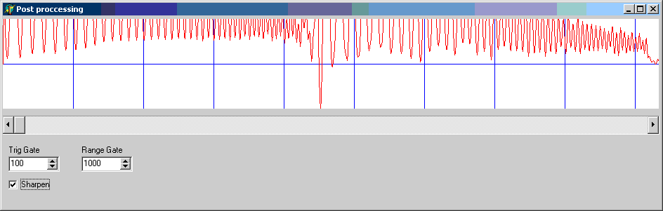 The next stage of processing is about finding a "trigger" to give a consistent reference when we process a series of chirps (such as in the sounder image below). My current method is the look for a correlation that is (for example) greater than 1/5 the largest value in the entire data set and then search (for example) the next 100 samples looking for the peak largest peak in this region. This is what the "trig gate" setting is about. I also do a crude gain adjustment to boost the distant echos and reduce the close ones. The is just a linear gain adjustment at the moment – it proably should be a square function but there are also reasons for keeping it linear which I may get into later. By the way these images are of different chirps – same type but different instances.