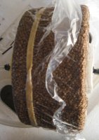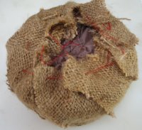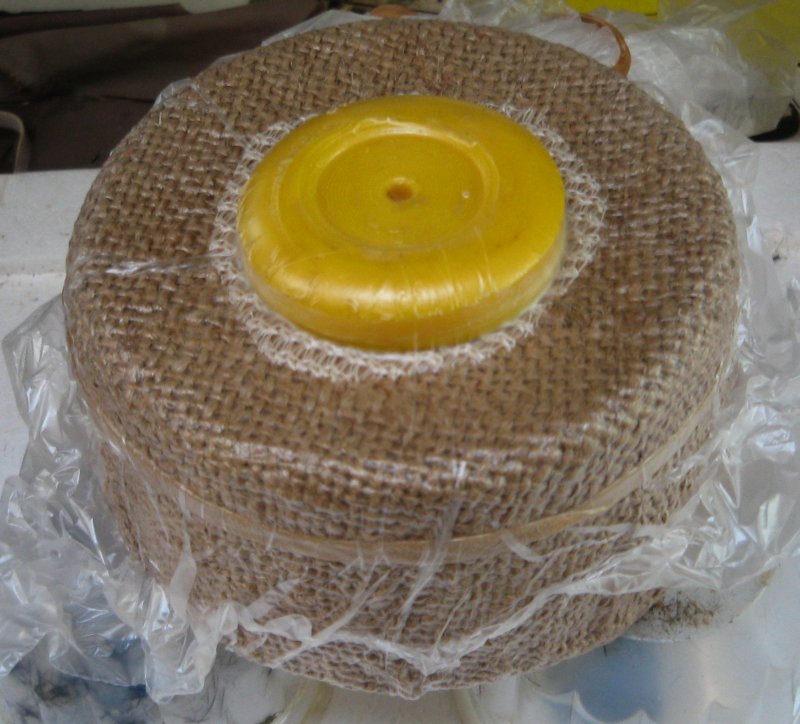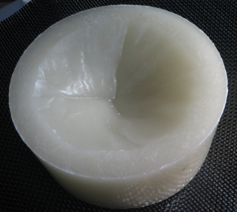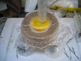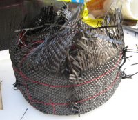 29'th July 2006. The plug was wax cast in yoghurt container. I wanted a little bit of a lip on the top so I made the outer top surface flat using a cheese grater. I also rounded the bottom edge. It took a long time to wrap it in carbon. There are four layers each loosely tied with red cotton to keep it in place. Then a layer of peel ply was added followed by the hessian. Under vacuum it holds it's shape pretty well. This is upside down compared to the previous photo. I infused what was the “bottom” because the “top” has overlapped layers of hessian which would soak up a lot of resin. If there had been more of a taper I would have aimed to infuse the “fat” end. As usual - initial infusion was rapid and slowing to a crawl towards to end. It only took a bit over a minute for the resin to reach the first edge but it took about thirty minutes to go all the way around. Once again vacuum is applied to the infusion port at the end. Sixty ml of resin was used. Here's a video clip of the first minute (10.25 meg). You can see me fill the syringe with resin and the hessian begin to darken a few second later. Cosmetically the outside of the piece is not perfect but it appears to be extremely strong and well bounded. It weighs in at thirty grams. The inside look quite good and some of the fine details from the original plastic tub are visible. I think this is close to prefect for the model I'm making and I could even reduce the thickness by a layer. The laminate does have pinholes. The big problem was removing the hessian from the piece. I will try to improve this but spending a few hours prising it off is not out of the question. The model is larger than this sample and that will make it easy to make. However it is more “boat” shaped and controlling the resin flow is more complicated. |